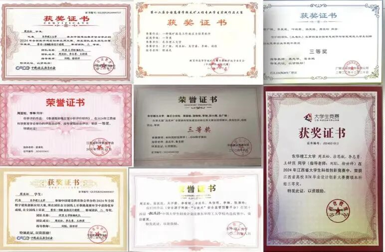 三、以创新为翼,翱翔双创蓝海 在科研方面,他积极探索、勇于实践,跟随班级导师组投身隧道防护领域研究,将课堂知识转化为科创成果,以第一、二作者累计授权软件著作权4项、实用新型专利1项,为行业科技进步贡献个人力量。在竞赛方面,他刻苦钻研、屡创佳绩,锚定地下空间智能建造技术,以BIM创新应用为矛,带领团队累计斩获BIM创新结构设计大赛等国家级奖项3项、省级奖项6项、校级奖项20余项。