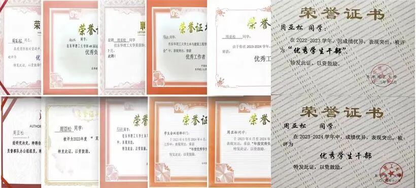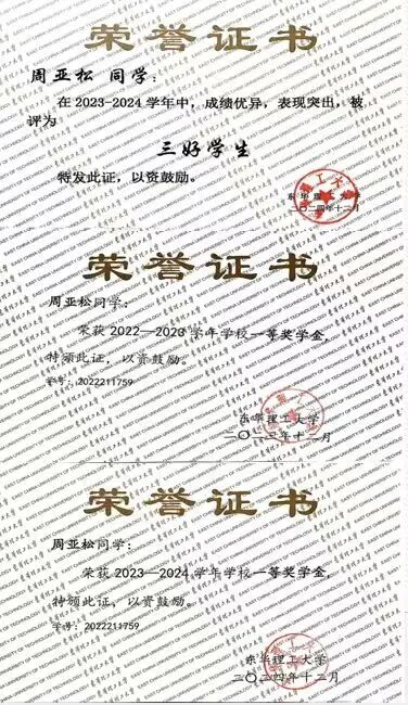 二、以学识为桨,深耕专业领域 他用扎实功底诠释“学在东华理工”的初心,展现出“学霸”的极致自律。从踏入校园的第一天起,他便深知学业是成长的基石。课堂上,他专注汲取知识,课堂外,他主动拓展阅读,遇到难题时反复钻研直至通透,正是这份坚持让他10余门专业课绩点超4.0,连续2年综合测评学分绩点排名专业前3,先后获得钱七虎班一等奖学金、“泰豪之星·十佳大学生奖学金”、校级“最美大学生”、“三好学生”、“优秀学生干部”等荣誉。